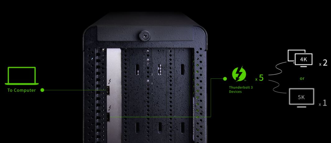 Designed to feature Thunderbolt™ 3 interface (40Gb/s) capable of providing PCIe bandwidth up to 2750 MB/s, 2x times Thunderbolt 2, for diverse professional PCIe cards such as video transcoding and video capture that primarily require higher throughput of data transfer rate to the host computer.