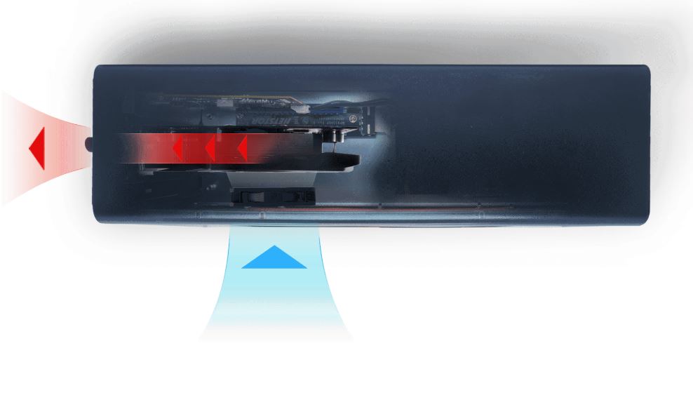 Built with one movable 8×8 cm speed-adjustable fan cooler at enclosure’s side, users can shift the cooler’s position at any time to have the best airflow ventilation to the video card based on each card’s length design and fan/blower location.