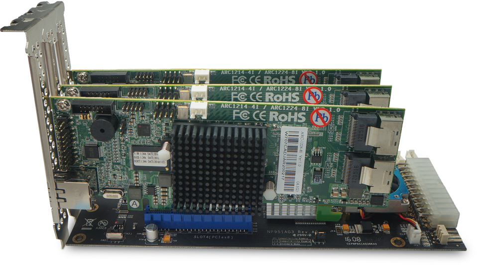Netstor NA333TB3 provides three PCIe 3.0 slots within the storage chassis that allow the users to make an easy expansion of varied specialty PCIe cards to the Thunderbolt 3 Mac. Except the necessary RAID adapter card to be added, the professionals can still choose to attach two more pro cards such as video capture, video transcoding, audio accelerator, network card and so on in the 3U storage to add extra performance to Thunderbolt Mac.