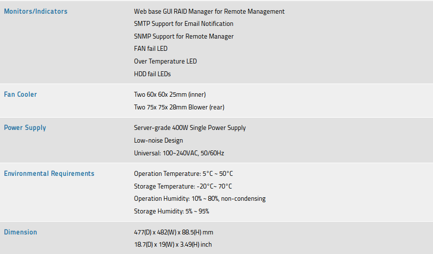It’s very easy for the MIS staff and the end-user to set up the NA341TB3 with the system. Through Netstor unit’s web GUI program, not only the hardware RAID can be set up, but the event notification by e-mail can also be activated. Hence, when a component fails or an HDD has an issue, the storage will buzzer alarm and will immediately send an event notification by email to the end-users to let them know the situation right away. Moreover, the storage has HDD failure indication with SGPIO support. When any HDD fails, the red LED indicator on the drive tray will light to allow the users to correctly find the faulty HDD for drive replacement and RAID rebuilding.