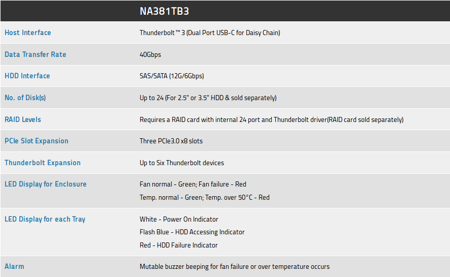 Provides three PCIe 3.0 slots within the storage chassis that allow the users to make an easy expansion of varied specialty PCIe cards to the Thunderbolt 3 Mac. Except the necessary RAID adapter card to be added, the professionals can still choose to attach two more pro cards such as video capture, video transcoding, audio accelerator, network card and so on in the NA381TB3 to add extra performance to Thunderbolt Mac.