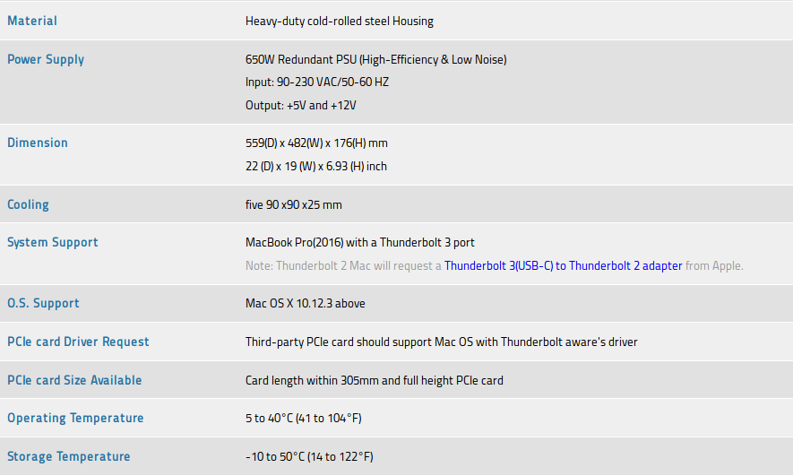 Designed to have Thunderbolt™ 3 greatly 40Gbps high-bandwidth for the fastest ever data storage access and operation with multiple professional PCIe cards, which meant to be the perfect companion to your empowered Thunderbolt Mac or workstation.