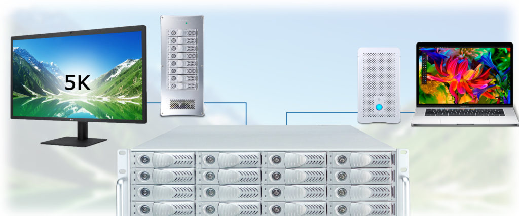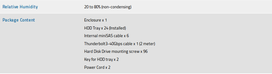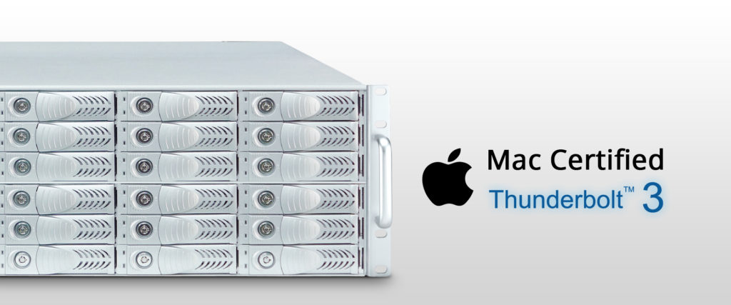 Designed 4U 24-bay storage chassis with support of twenty-four hot-swappable drive trays. As each tray attached with 10TB HDD, total usable storage will come to 240 TB capacity. Additionally, through enclosure’s lightning-fast Thunderbolt™ 3 interface, the ultra large storage is ensured to have higher data transfer bandwidth of up to 2750 MB/s for all kinds of data archiving and real-time editing.