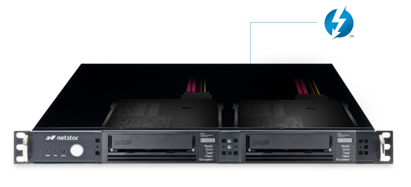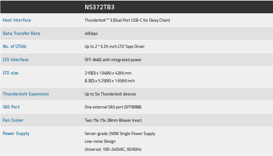 The NS372TB3 1U Rackmountable 2-bay LTO Tape Drive to Thunderbolt™ 3 Enclosure transforms any internal half-height LTO tape drive to Thunderbolt 3. The NS372TB3 has been thoughtfully designed with two SFF-8482 connectors inside to support up to dual LTO tape drives; latest LTO drives such as LTO-8, LTO-7, and LTO-6 from Quantum, HP, Dell, and IBM are all supported to work with the Netstor 1U enclosure.