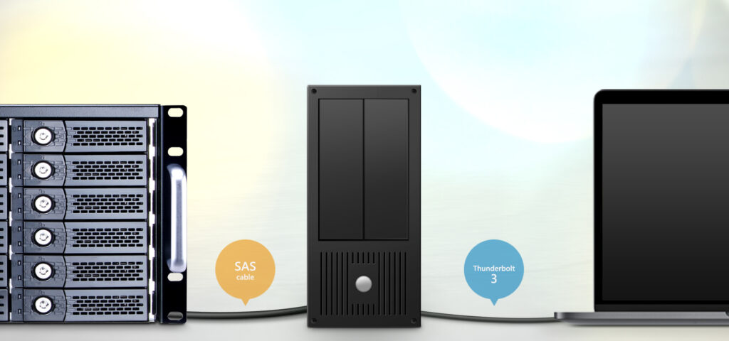 Without the need to add an HBA card in the host computer in order to connect with the LTO drive device, now users can simply connect NS722TB3 storage to any Thunderbolt™ 3 macOS/Windows laptop, or all-in-one such as iMac to make LTO archiving available to the Thunderbolt™ 3 host.