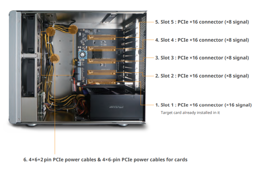 The GPU enclosure is designed to have 4 PCIe x16 slots (x8 electrical) on NA255A backplane supporting up to 4 double-width PCIe Gen3 GPU cards, or single-slot PCIe cards. In addition, the enclosure can accommodate all combinations of PCIe 3.0 ×1, ×4, ×8 and ×16 GPU/PCIe cards for every application with backward compatibility for Gen2 cards to work with host, server or workstation in areas such as HPC, telecom, and data centers.