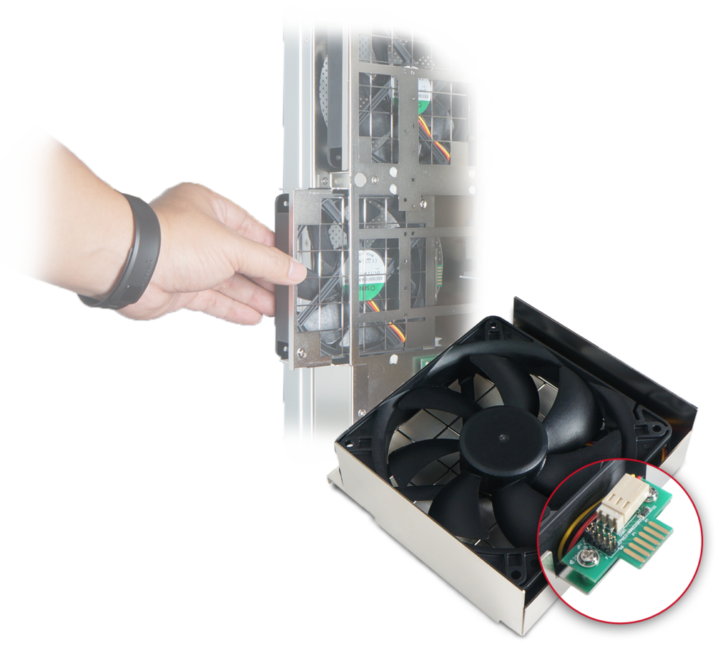 NA255A is equipped with two front large 12×12 cm cooling fan modules with each fan in support of 75 CFM, providing best airflow ventilation to enclosure for most excellent heat dissipation ever, and ensuring graphics cards within chassis can run long term without any high temp concern. Moreover, the fan speed of each cooling fan can be adjusted manually according to GPUs application situation within NA255A GPU chassis.